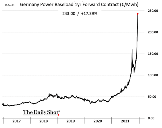 Consecuencia de estos combates geopolíticos: el precio de los contratos de electricidad para el año próximo están en alza de 400% en Alemania y casi en toda Europa: