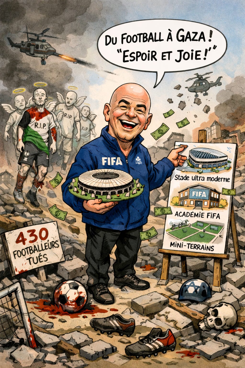 Non, vous ne rêvez pas. Il a vraiment raconté tout ça. Il se fout de qui ? Des plus de 800 sportifs palestiniens, dont plus de 430 footballeurs, assassinés par Israël à Gaza depuis 868 jours, soit en moyenne 1 sportif par jour et 1 footballeur tous les 2 jours ?